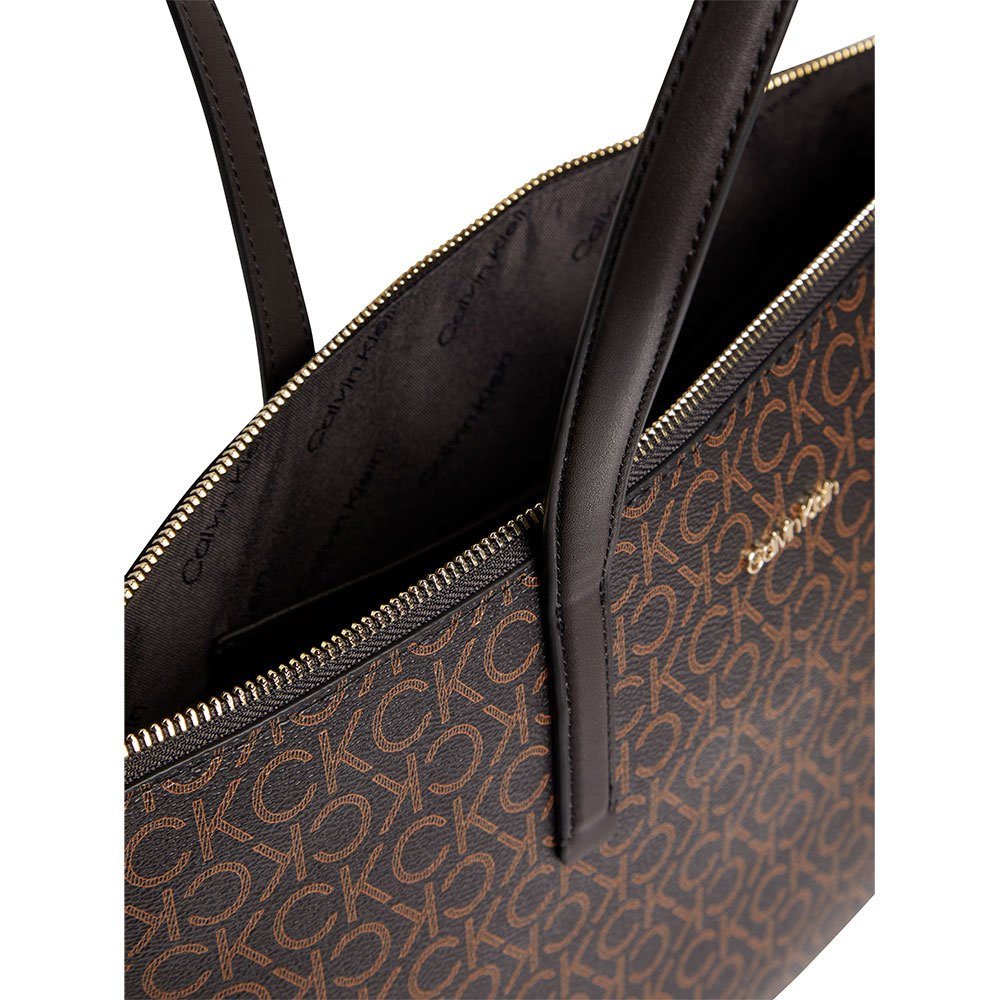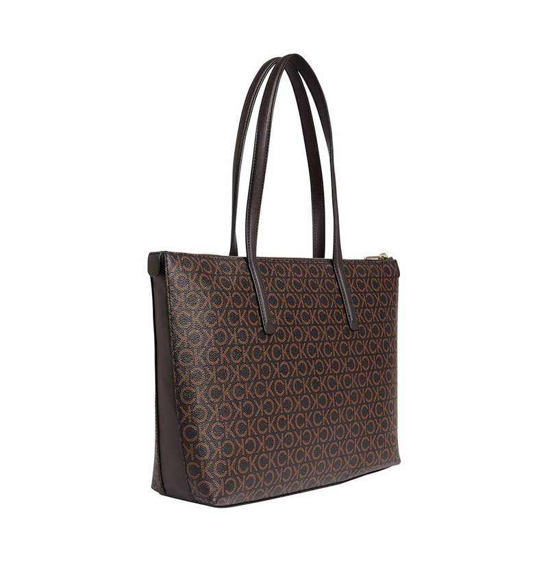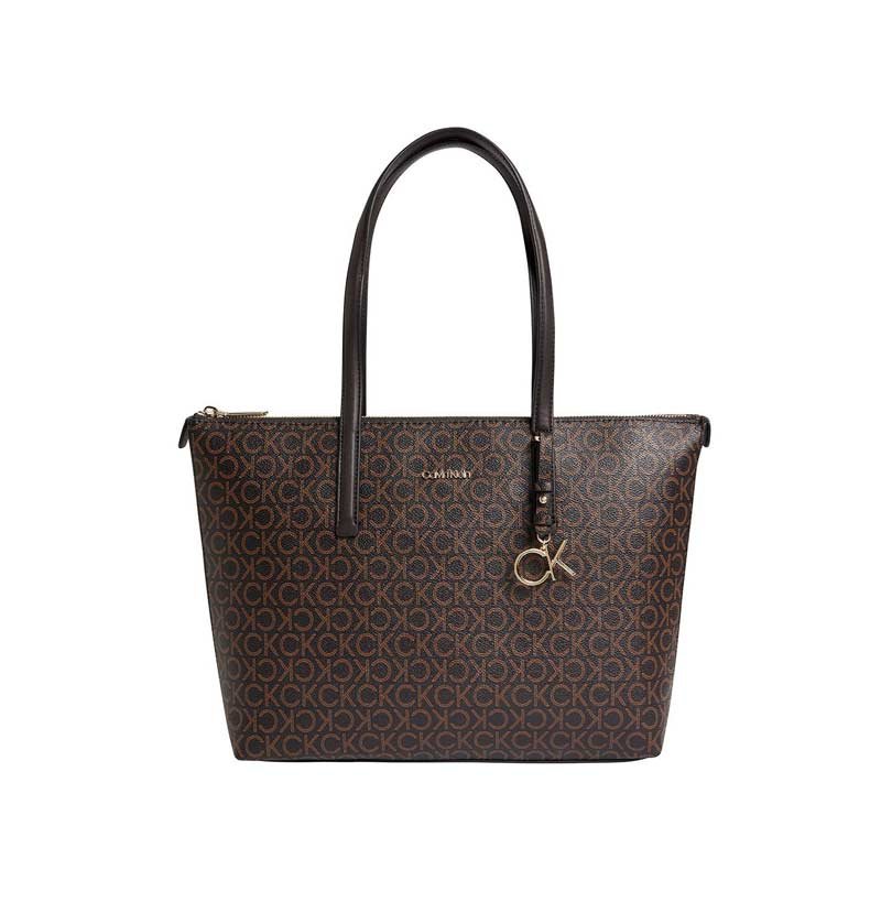 Women´s Calvin Klein Monogram Brown Shopper Bag With Zipper And Shoulder Handle, Metallic Front Logo And Metallic Logo Pendant.