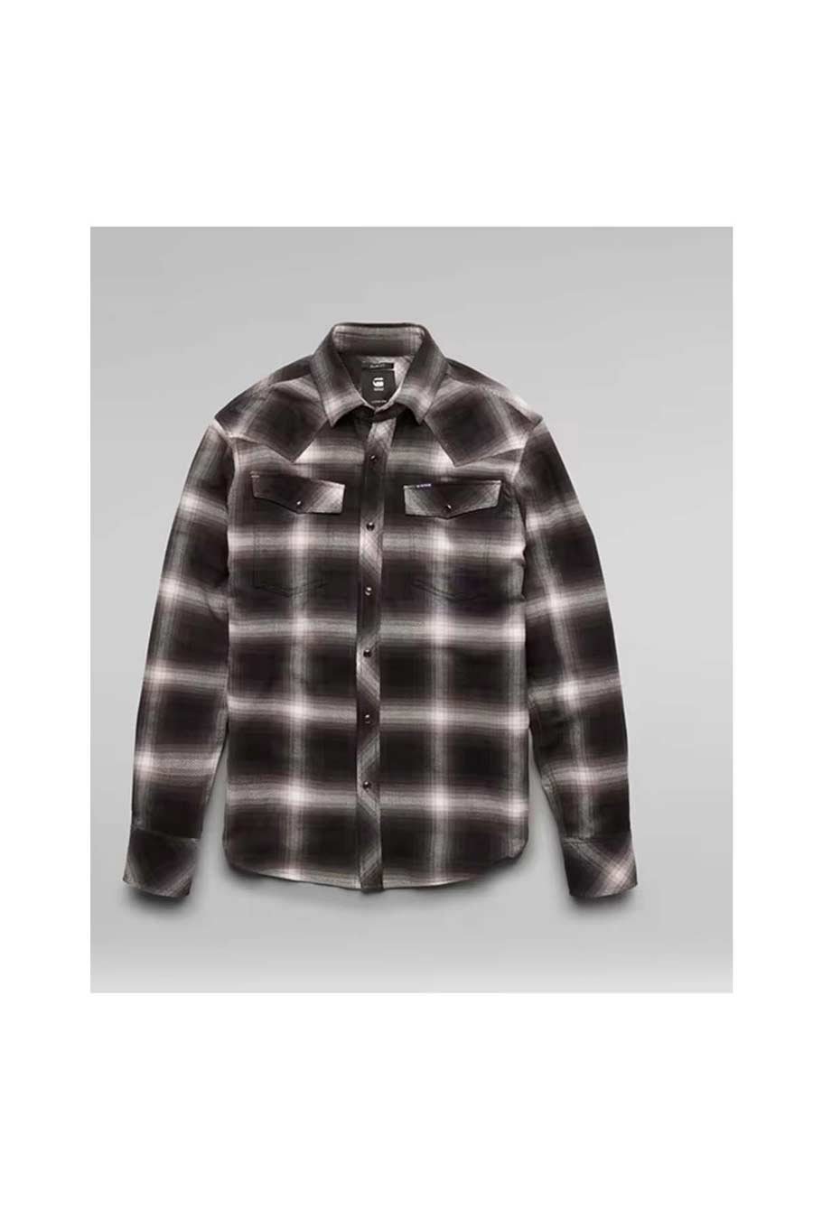 This 3301 shirt is based on an authentic western shirt. This slim fit version is cut from a check fabric. Patched on flap pockets are combined with shoulder panels. This shirt shows a snap button closure.