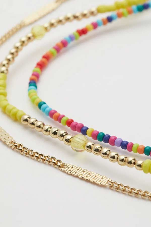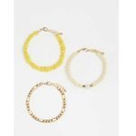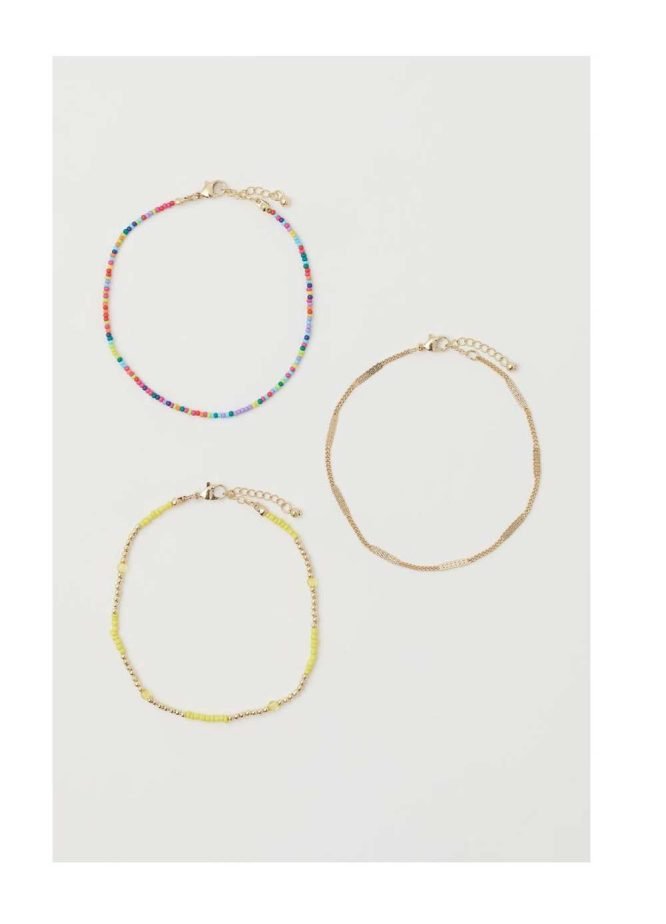 Anklets in various designs including two with glass beads in vibrant colours and one in metal chain. Adjustable length and a trigger clasp.