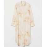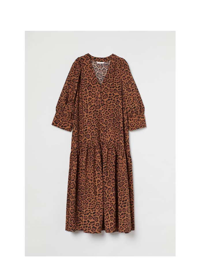 Calf-length dress in an airy weave made from a viscose blend with a deep V-neck and wide, 3/4-length puff sleeves with wide cuffs. Asymmetric, gathered seam in the skirt for added width. Unlined.