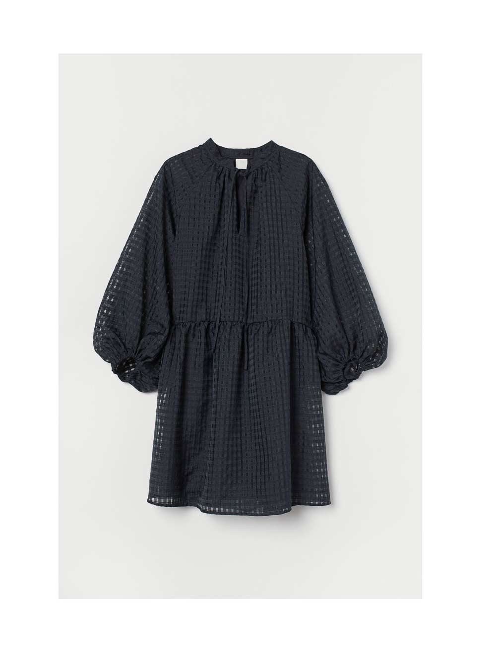 Short, A-line dress in an airy weave. Features a small stand up collar and an opening at the front with narrow ties at the neckline. 3/4 length balloon sleeves in a raglan cut with concealed elastication at the cuffs. Gathered seam at the waist and a flared skirt. Jersey lining. Some of the polyester content is recycled.