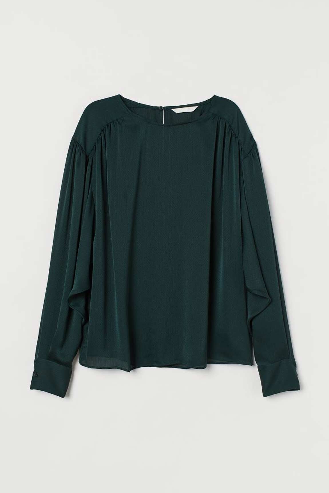 Blouse in a softly draping weave with a round neck and small opening at the back with a concealed button at the back of the neck. Gathered seams on the shoulders, long batwing sleeves with buttoned cuffs, and a rounded hem.