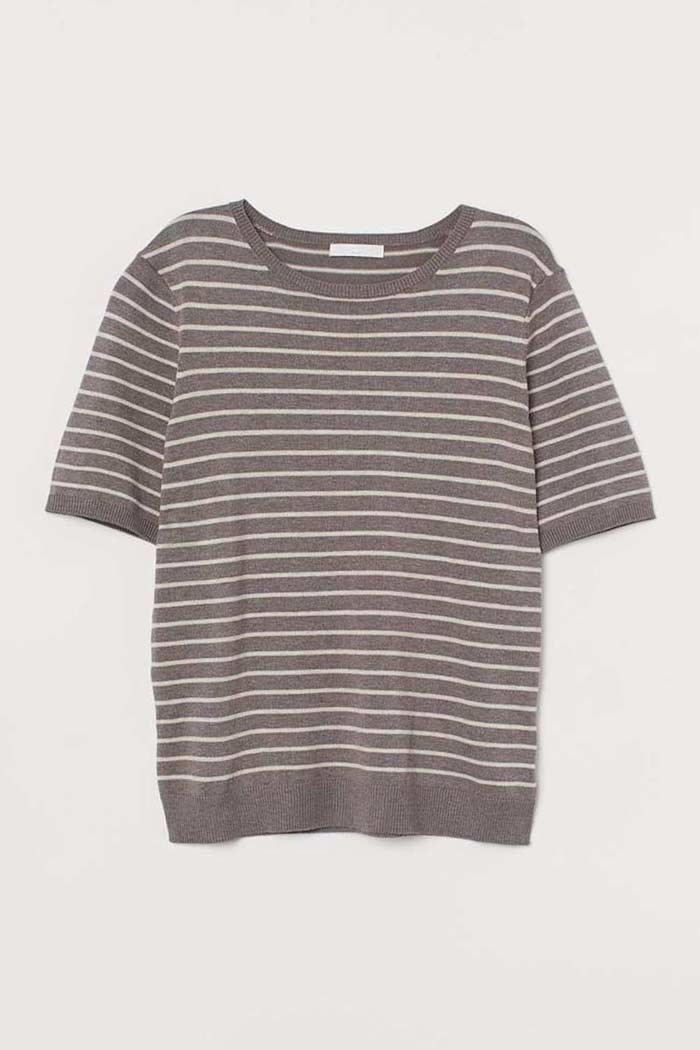 Fine-knit, short-sleeved sweater in a soft viscose blend with ribbing at neckline, cuffs, and hem.