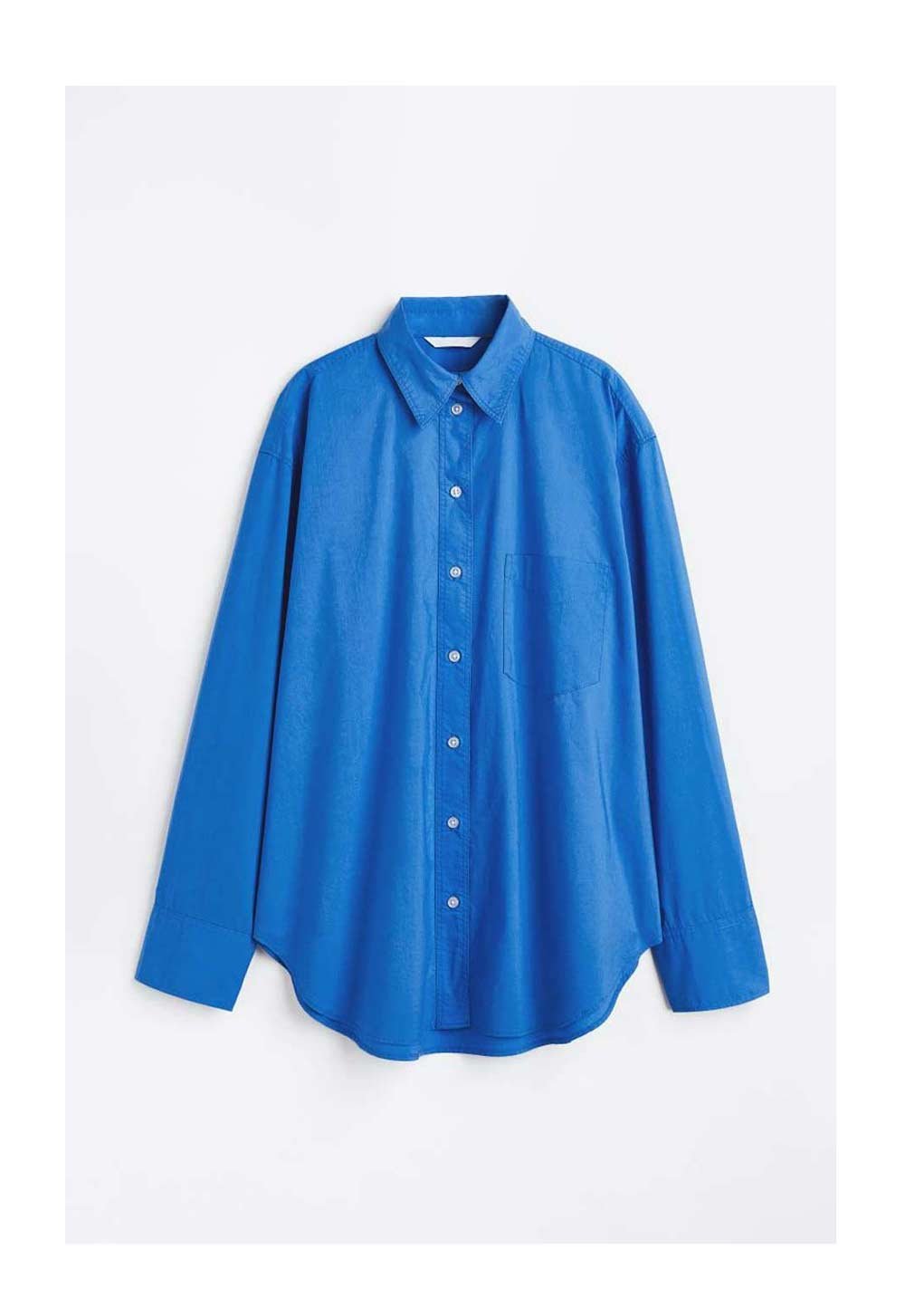 Cotton poplin shirt with a collar, buttons on the front and a pleat on the back. Low shoulders, long sleeves with buttons at the cuffs, open chest pocket and rounded hem.