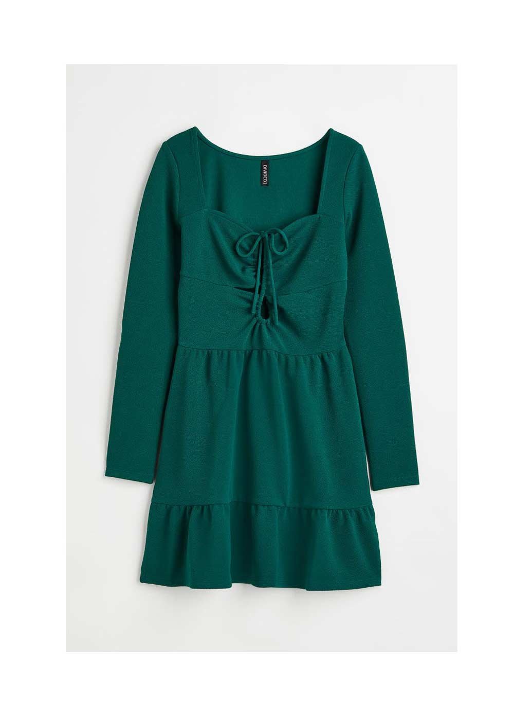 Short dress in soft crepe jersey with a sweetheart neckline and a lace-up front opening. Long sleeve, hidden side zip, gusset seam at waist and wide ruffle at hem. No lining.