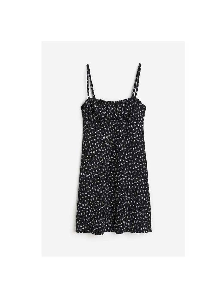 Short dress in crinkled jersey with narrow, adjustable shoulder straps, a square neckline and a gathered seam below the bust. Fitted bodice and a gently flared skirt. Lined over the bust.