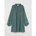 Short, fitted dress in a crêpe weave with a collar, V-neck and buttons down the front. Long sleeves and wide cuffs with a slit. Gathers down the button band for a draped effect. Unlined.