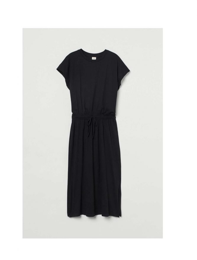 Calf-length dress in cotton jersey with a round neckline, short sleeves, an elasticated seam with a drawstring at the waist, and slits in the sides of …
