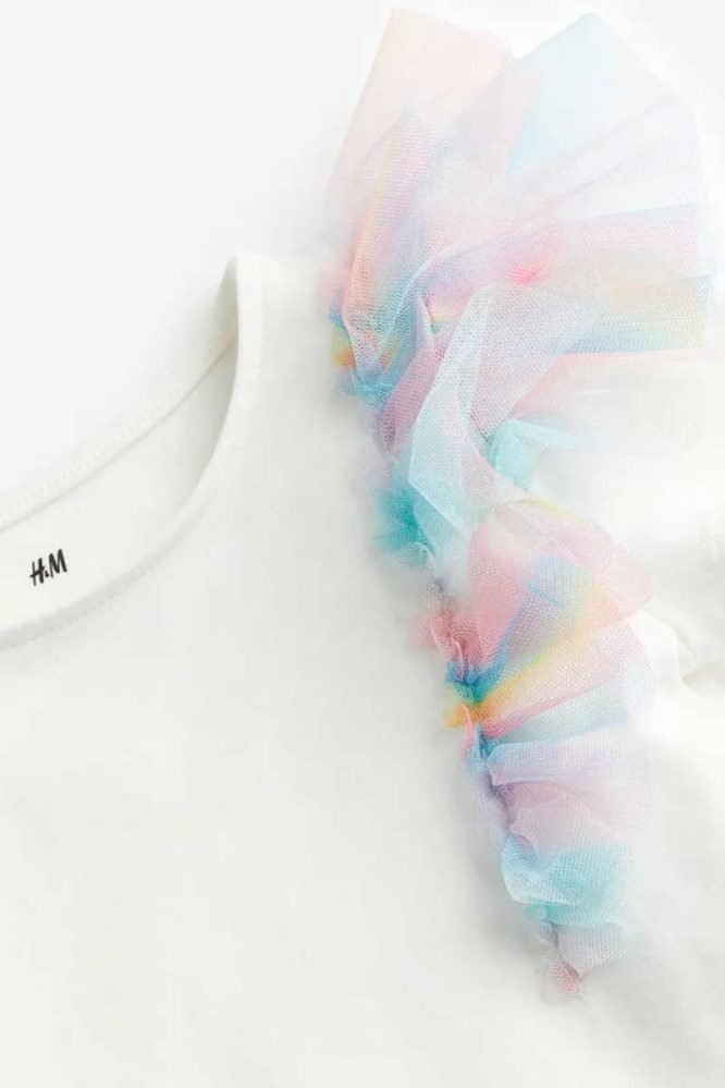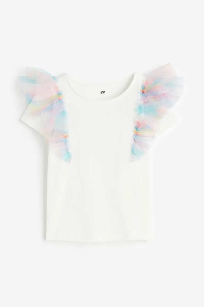 Short-sleeved top in soft cotton jersey with double tulle flounces over the shoulders.