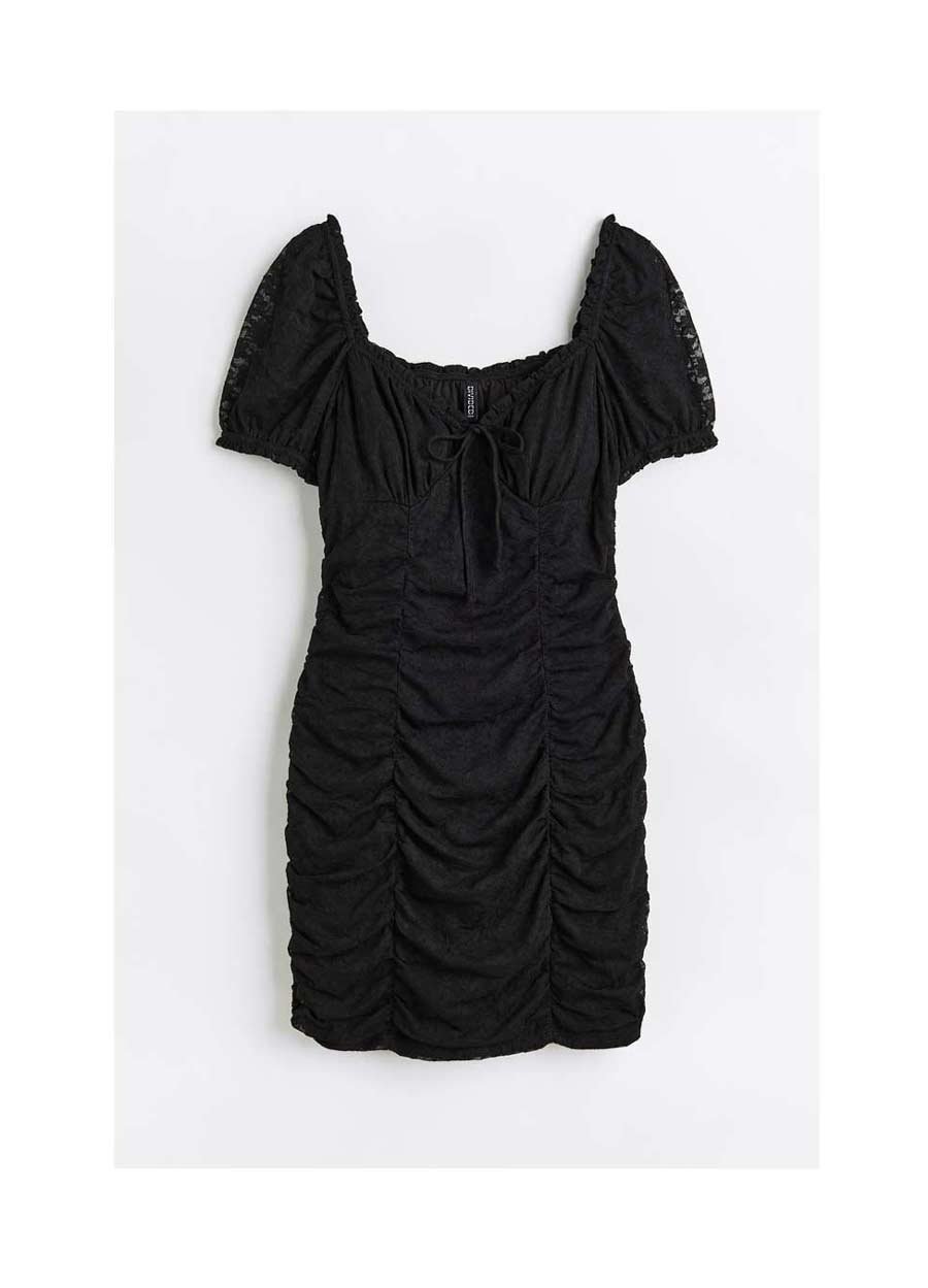 Short, fitted dress in woven fabric with eyelet embroidery and vertical seams with concealed elastic for a gathered effect. Sweetheart neckline, elastic over shoulders, and short puff sleeves with elasticized cuffs. Lined.