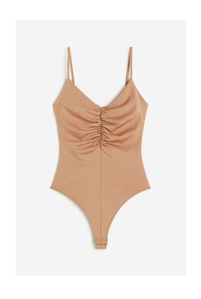 Thong body in jersey with narrow shoulder straps, gathers at the centre of the bust and concealed press-studs at the crotch. Partly lined.