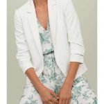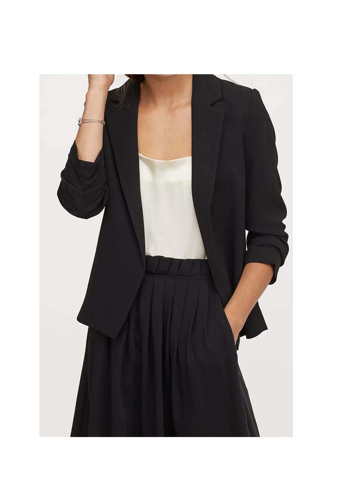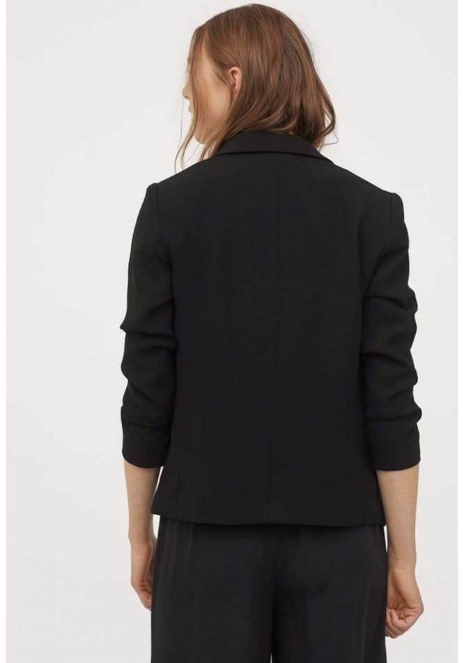 Gently tailored jacket in a crêpe weave with notch lapels, gathered, 3/4-length sleeves and side pockets. No fasteners. Lined.