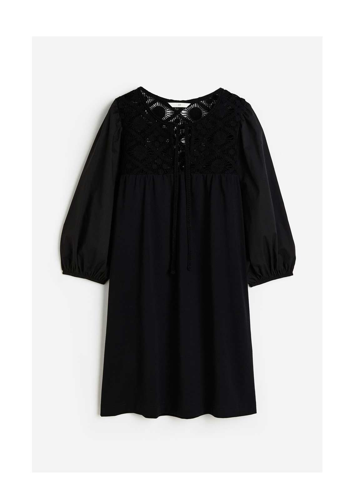 Short dress in soft cotton jersey with a crochet-look yoke in lace at front and back. Round neckline with a V-shaped opening and narrow ties at front. Elbow-length balloon sleeves with narrow elastic at cuffs.