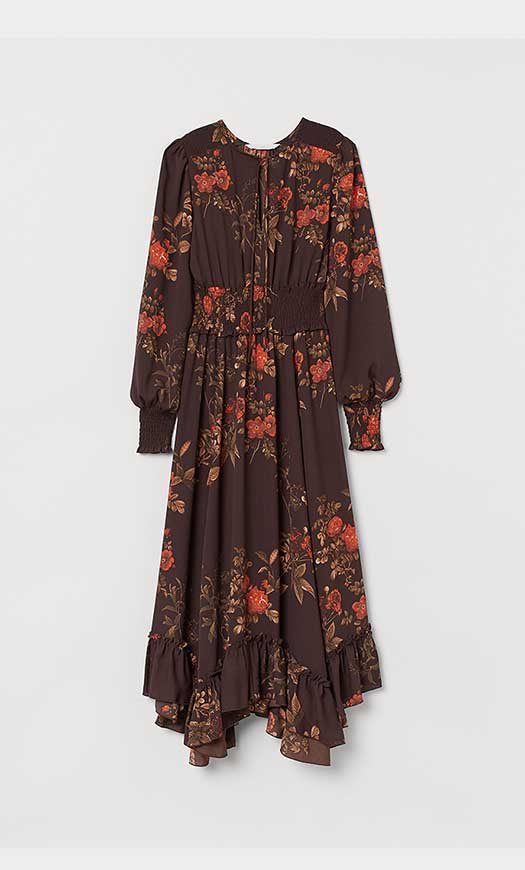 Long dress in patterned chiffon crêpe with smocking at the shoulders, cuffs and waist. V-neck with ties at the top, long puff sleeves and a flounce at the hem. Unlined.