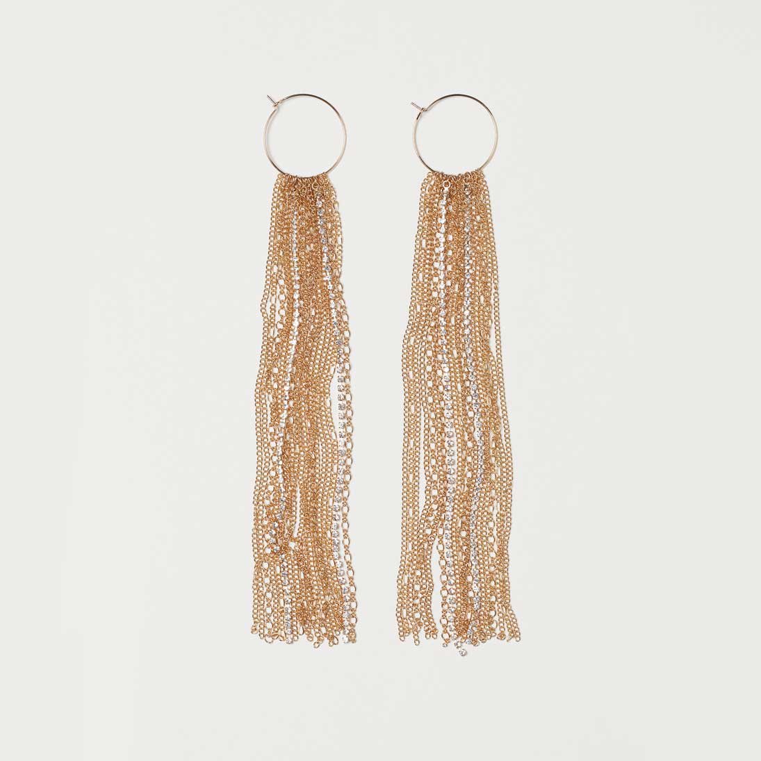 Metal hoop earrings with narrow metal chain and rhinestone tassels. Length 7 1/2 in.
