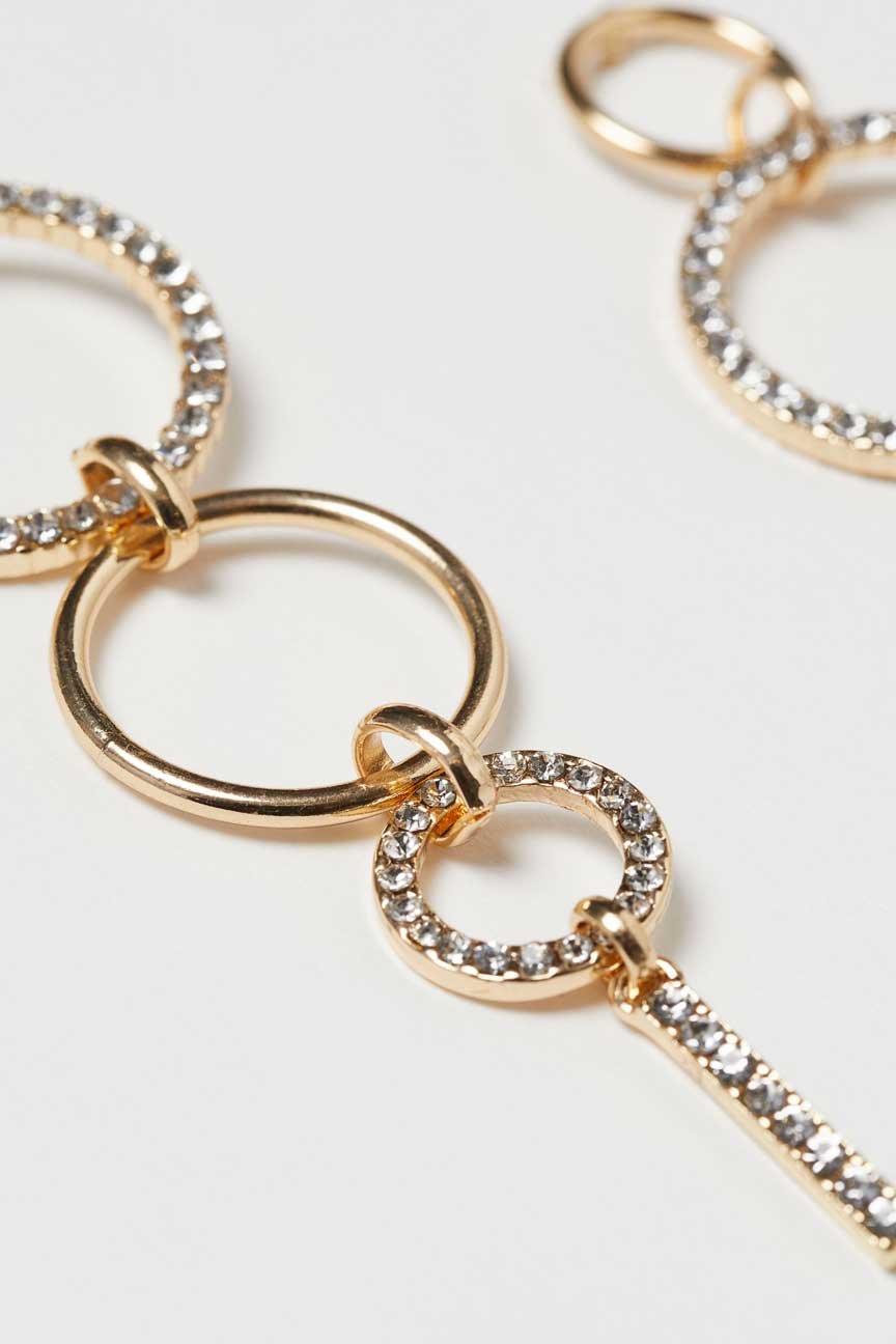 Long metal earrings decorated with rhinestones.