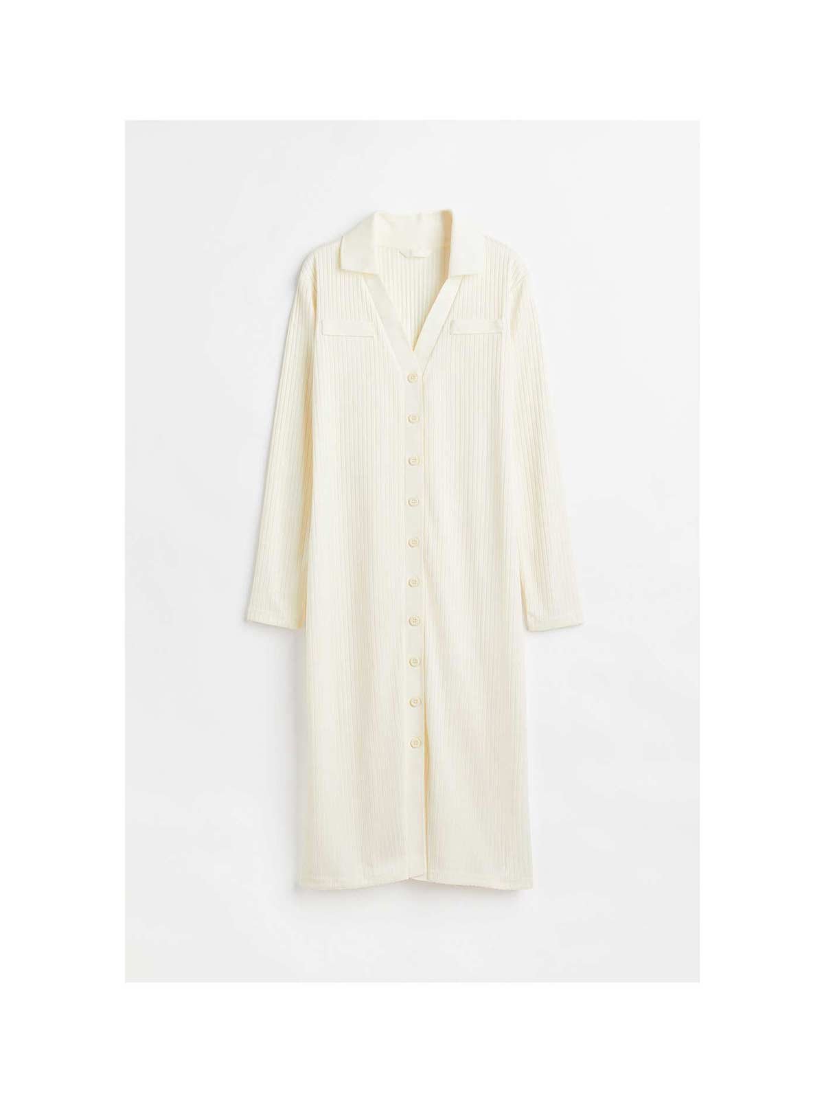 Calf-length dress in ribbed jersey with a collar, V-shaped opening at the top and buttons down the front. Gently dropped shoulders and welt chest pockets.