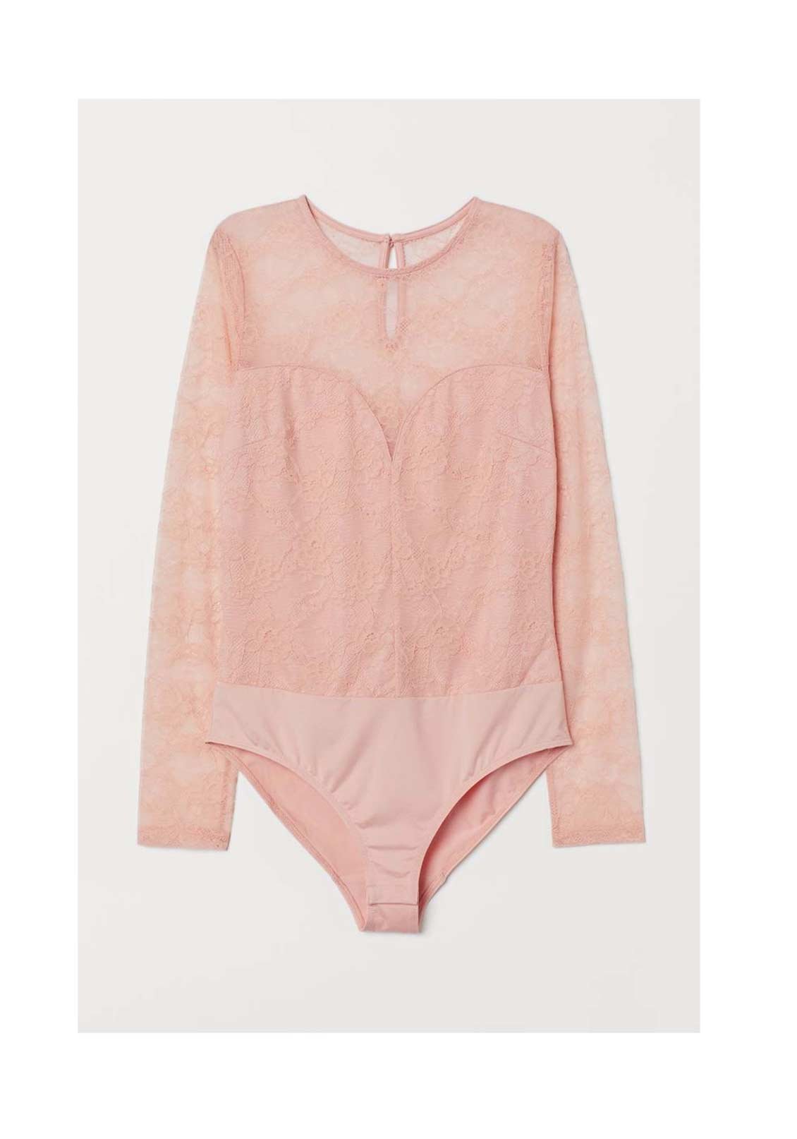 Long-sleeved body in lace with a lined front, round neckline and an opening with a covered button at the back of the neck. Seam with a jersey lower section, a lined gusset, and concealed press-studs at the crotch.