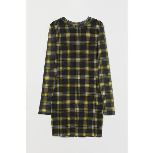 Short fitted mesh dress with round neck and long sleeves.