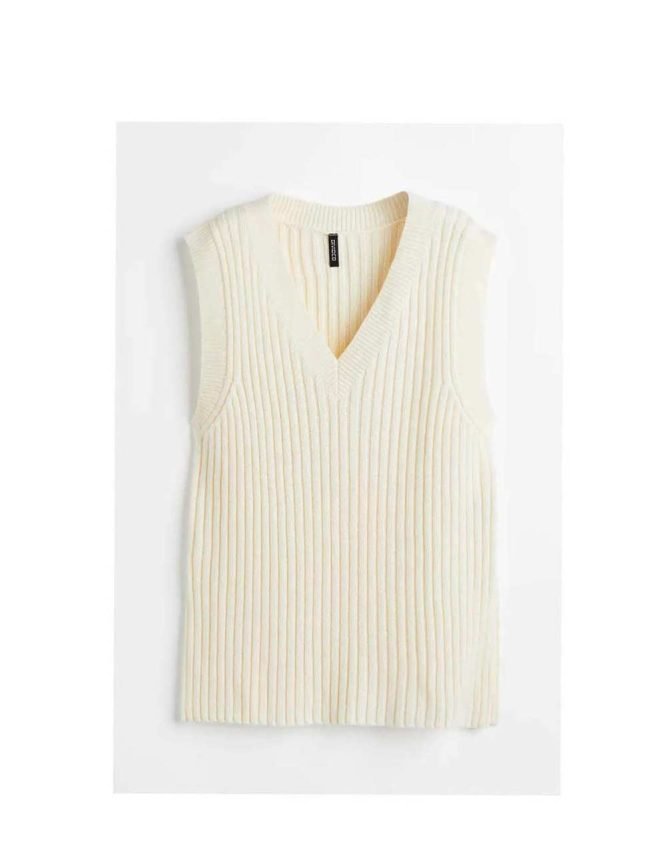 Oversized vest in a soft rib knit. Features a V-neck and narrow ribbing around the neckline and armholes. Straight hem with a slit in each side of the hem.