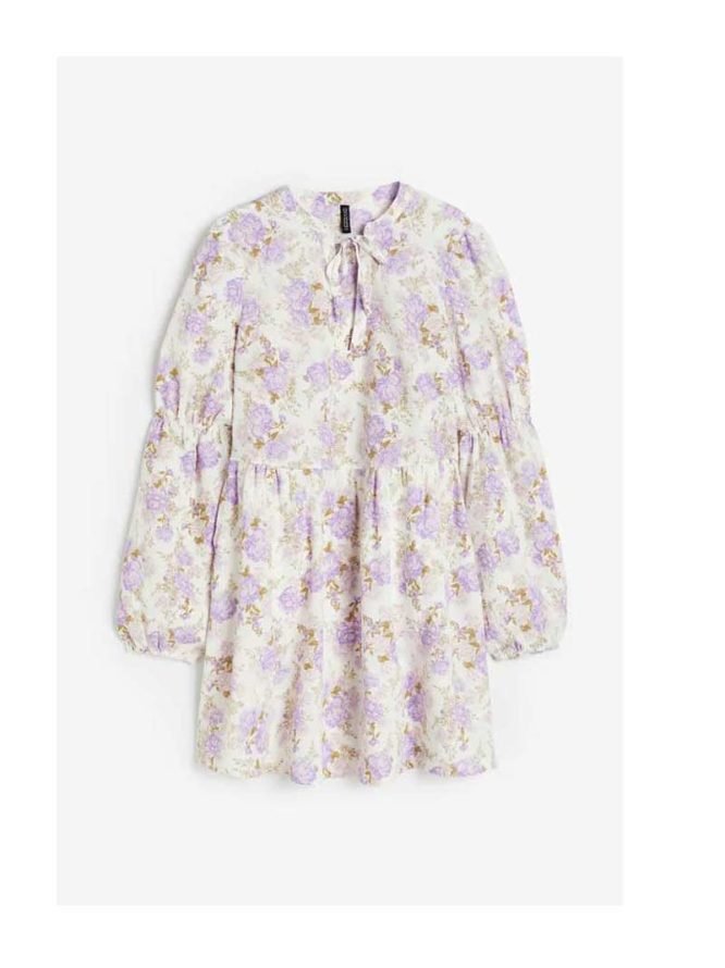Short, A-line dress in a patterned crêpe weave. Features a round neckline and a V-shaped opening at the front with narrow ties. Loose fit with long sleeves and pockets in the side seams. Narrow elastication at the elbows, cuffs and waist. Partly lined.