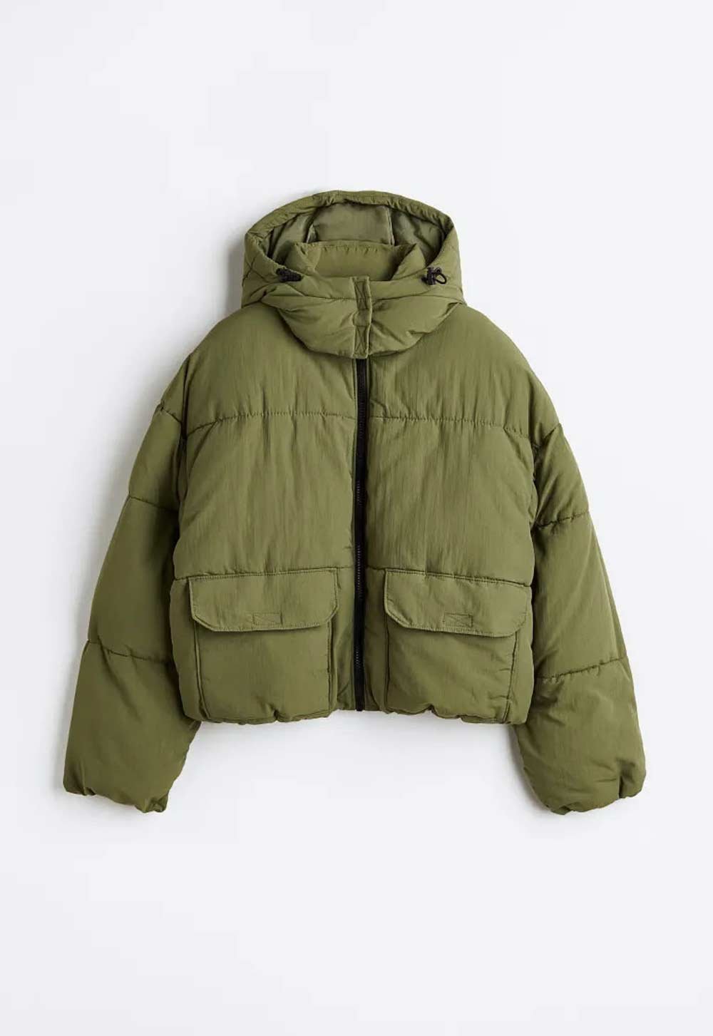 Short quilted jacket with a loose fit. Lined hood with elastic drawstring and a wide chin guard with Velcro. Stand-up collar, front zip and flap pockets with Velcro fasteners. Narrow elastic band on sleeves and hem. Fed.