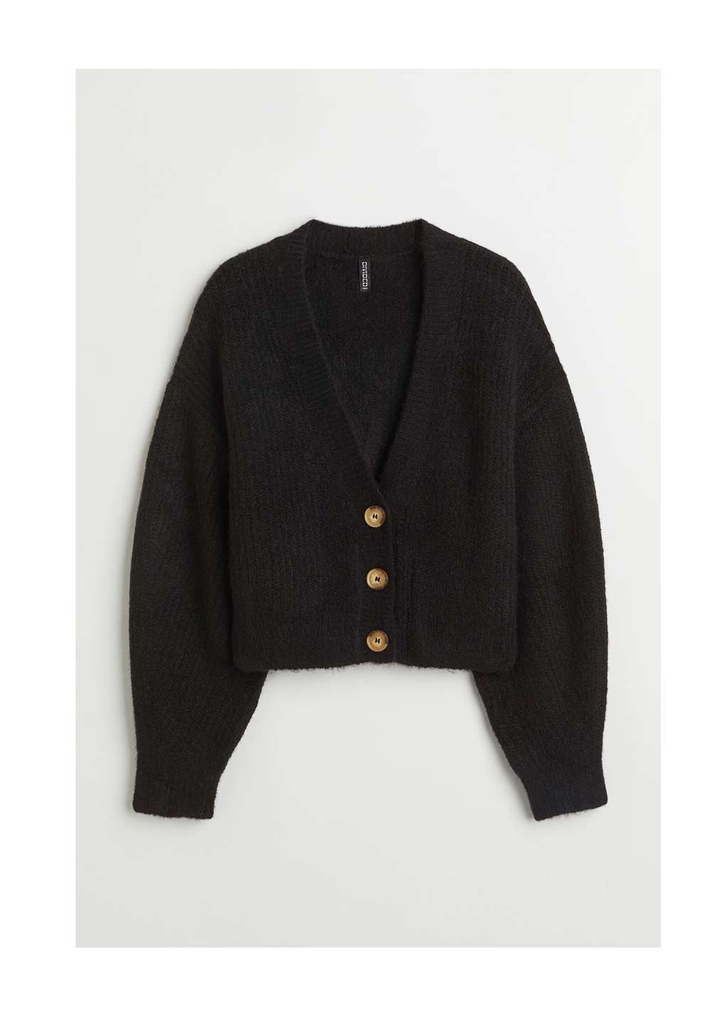 Cardigan in a soft rib knit containing some wool with a V-neck and buttons down the front. Dropped shoulders and long, wide sleeves with close-fitting cuffs.