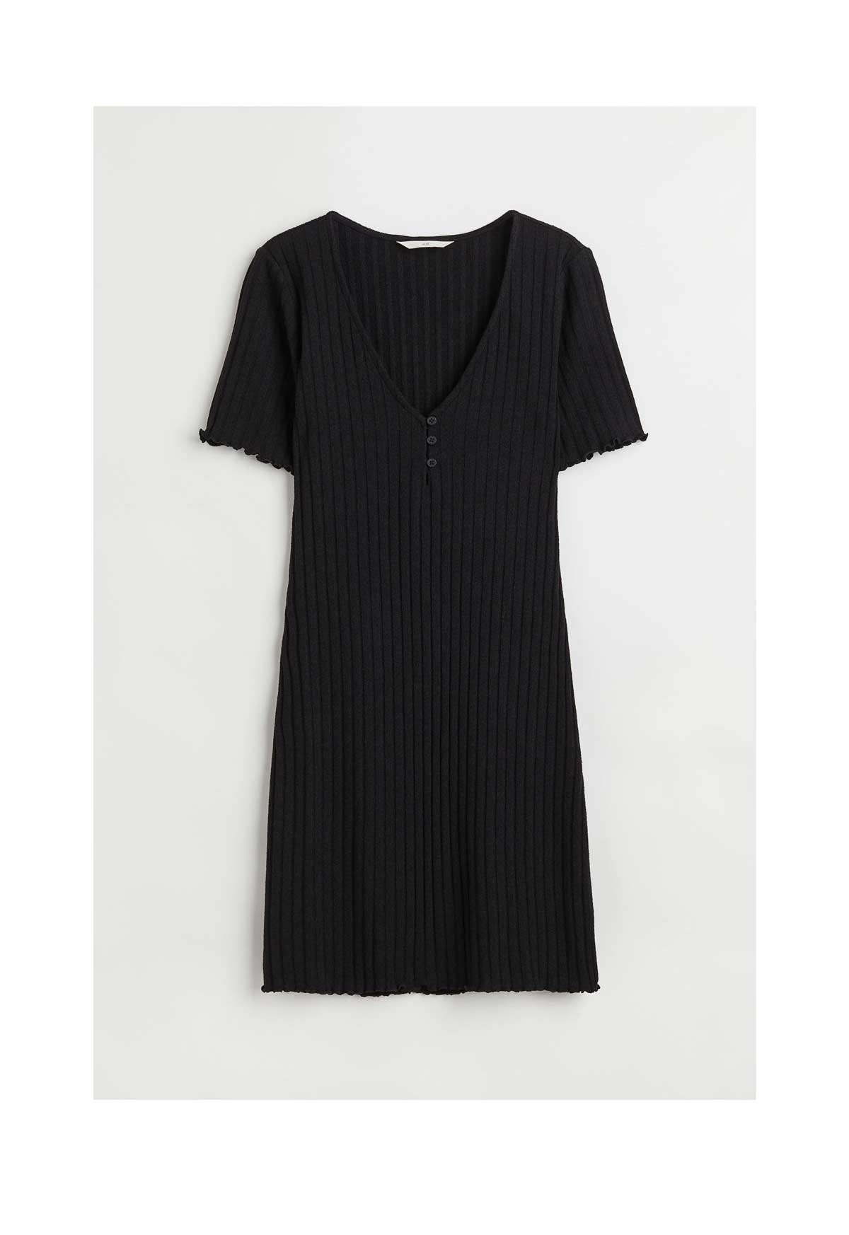 Short, fitted dress in ribbed jersey. V-neck, buttons at top, and short sleeves. Overlocked edges at cuffs and hem.