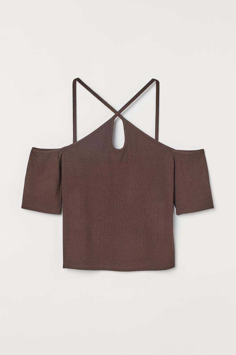 Short-sleeved, cold shoulder top in ribbed viscose jersey. Fitted style with a cut-out section and narrow shoulder straps that cross at the front.