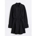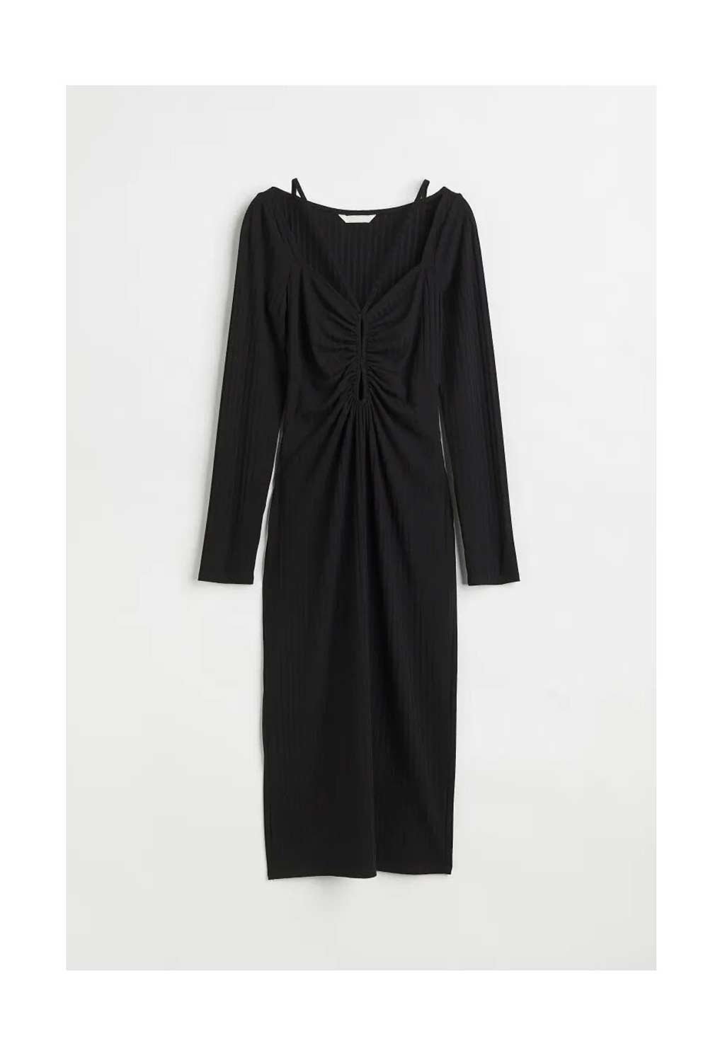 Fitted, calf-length dress in ribbed jersey with gathered elastic at front for a draped effect. Sweetheart neckline and cut-out sections at front with narrow straps to tie at back of neck. Long sleeves. Unlined.