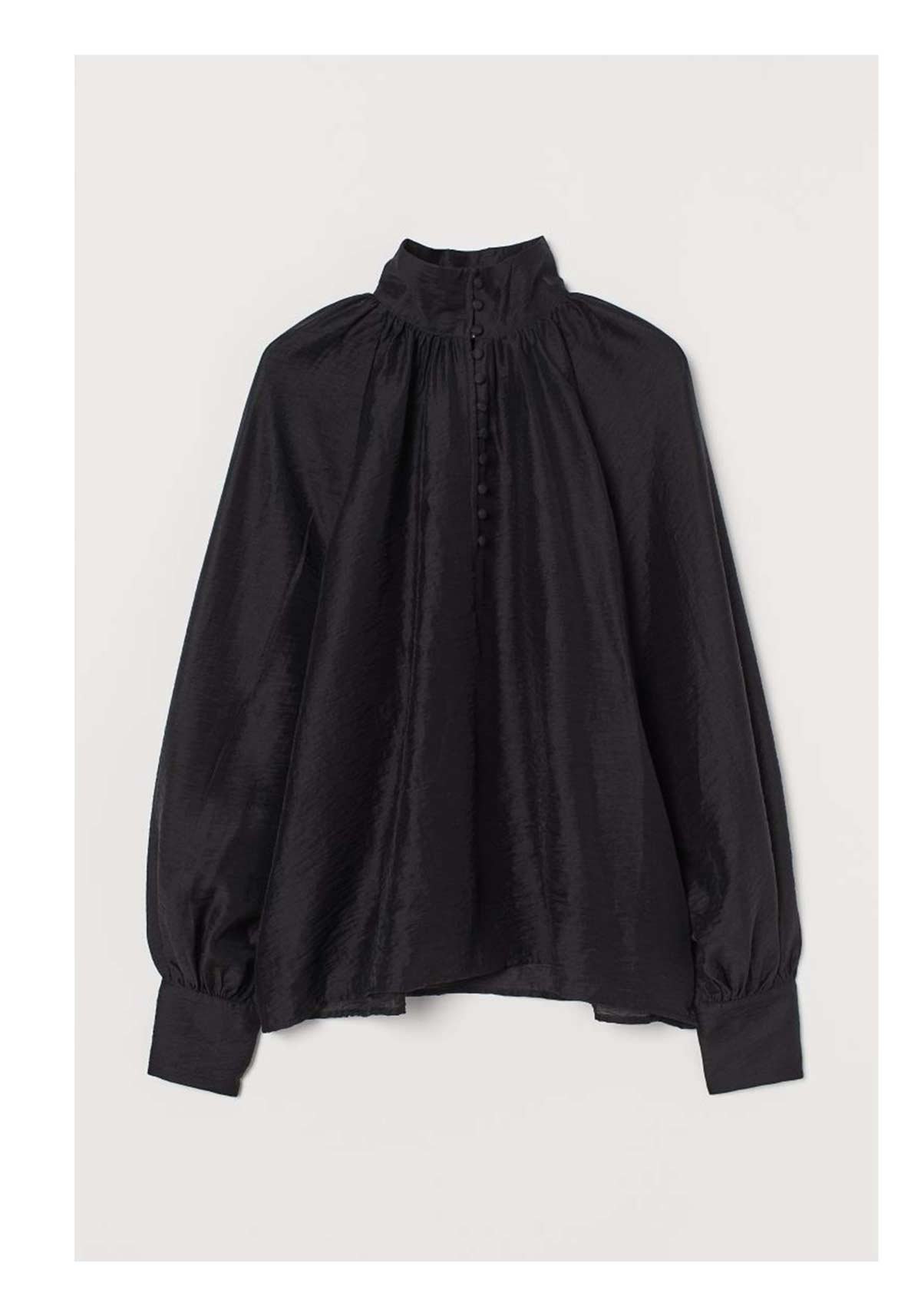 Blouse in softly draped satin made from a Tencel™ lyocell blend. High stand-up collar, covered buttons at top, long balloon sleeves, and wide cuffs with buttons. Gathers at neckline and cuffs for added volume and soft draping.