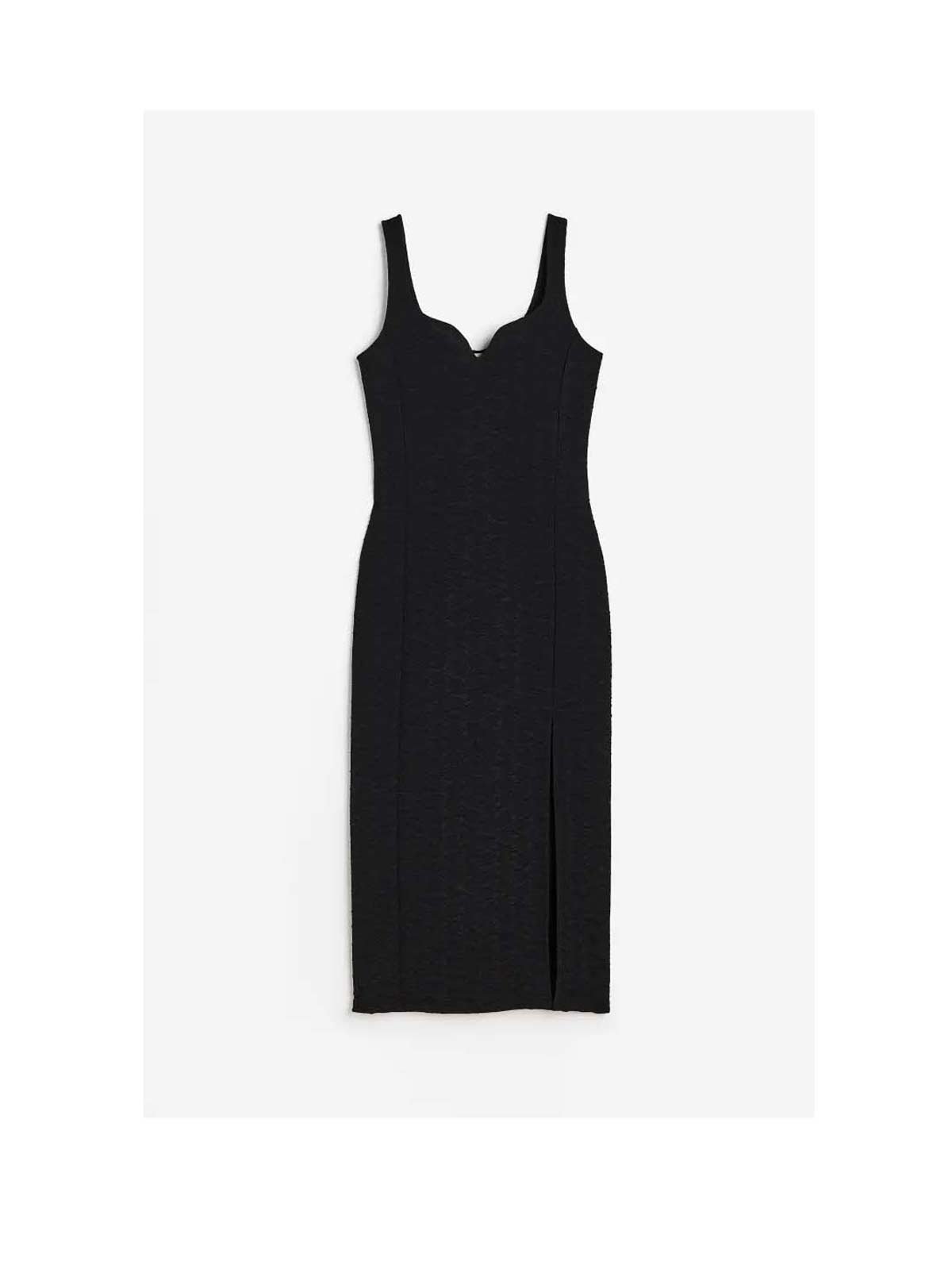 Sleeveless, calf-length bodycon dress in textured jersey with a sweetheart neckline. Straight hem with a high slit at one side of front.