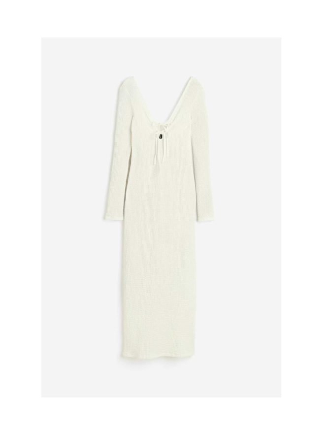 Calf-length, fitted dress in a textured knit with a deep, V-shaped neckline and two pairs of narrow ties at the front. Low-cut back, long sleeves and a straight hem.