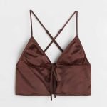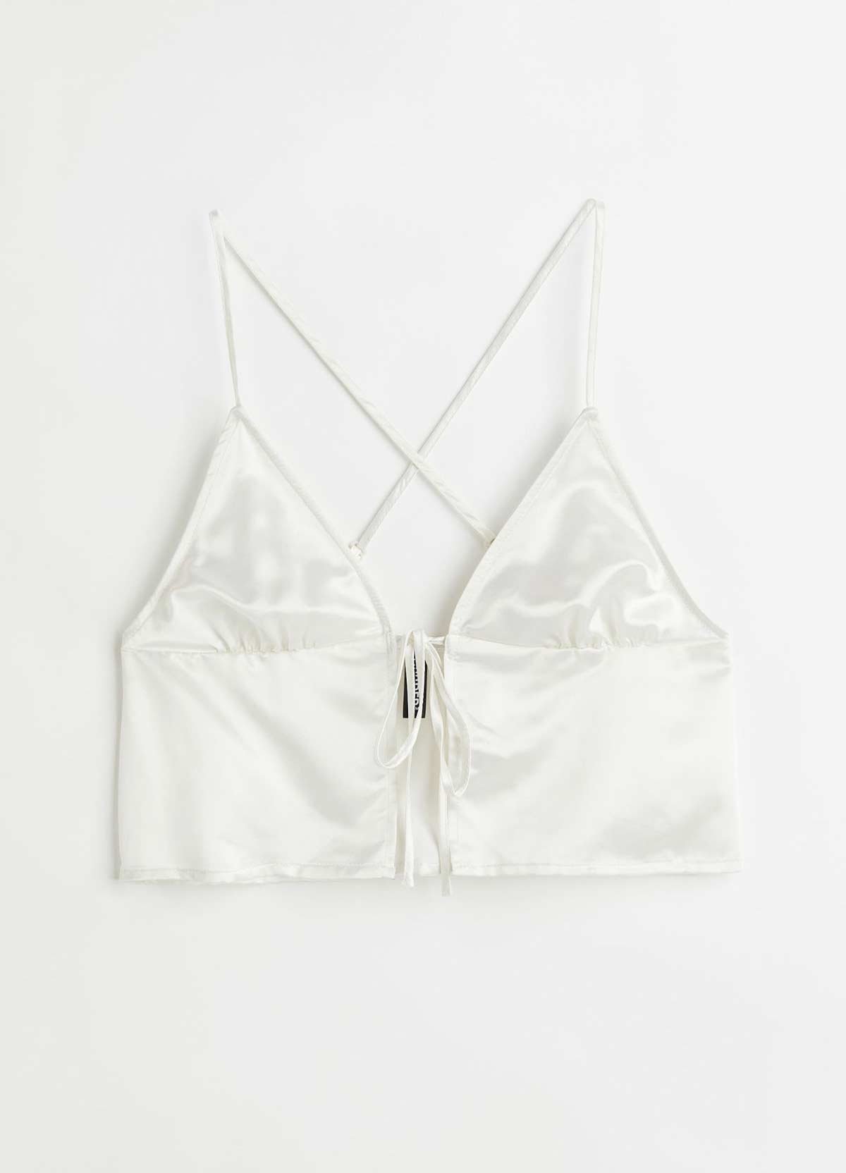 Satin top with narrow, adjustable shoulder straps that cross at the back. V-shaped neckline with shaped cups and an open front with narrow ties at the top. Unlined.