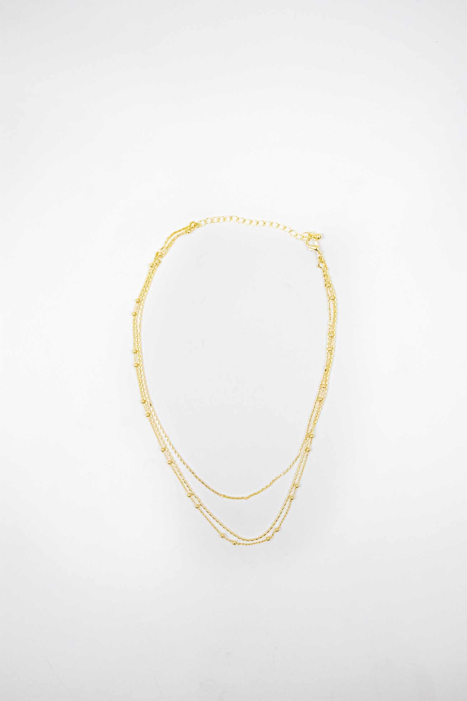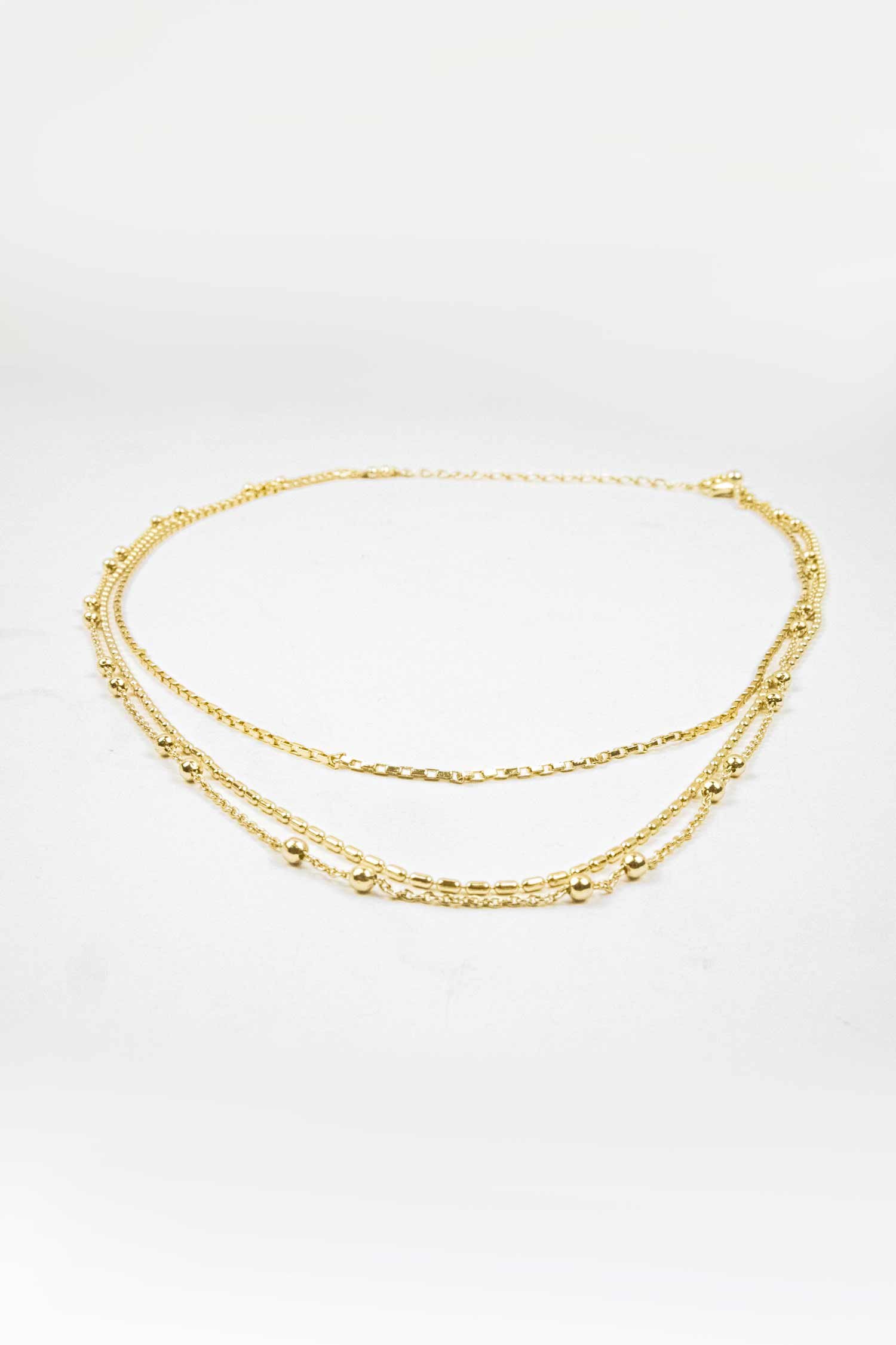 Triple-strand necklace made from narrow metal chains with variously-shaped pendants.