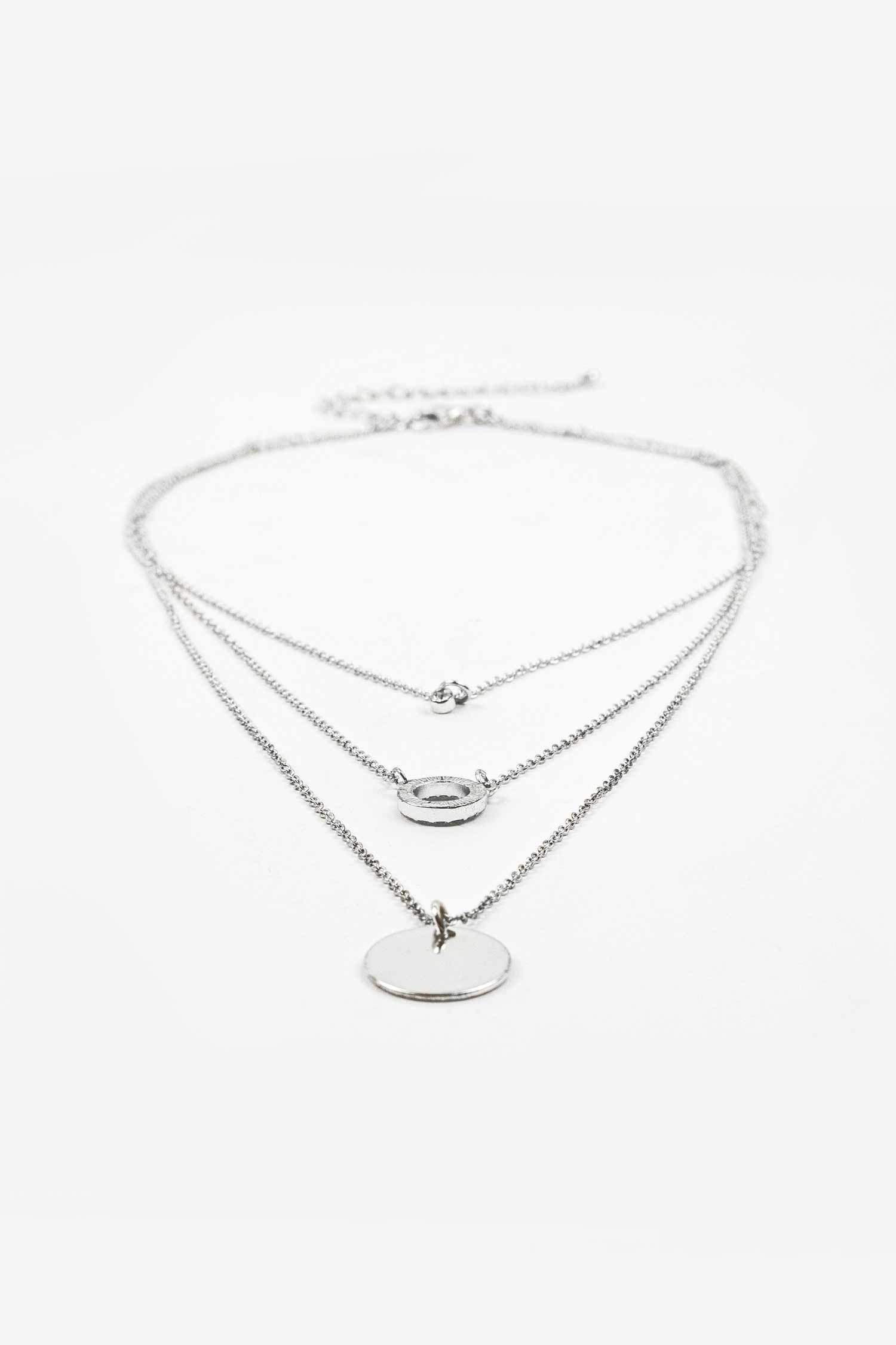 Triple-strand necklace made from narrow metal chains with variously-shaped pendants.