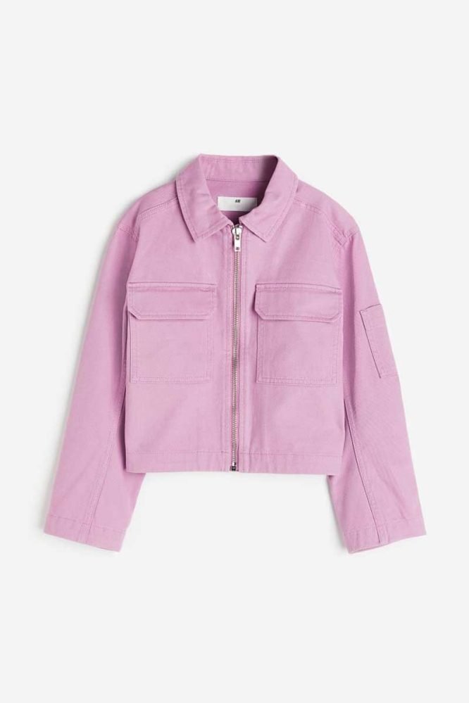 Jacket in cotton twill. Collar, zipper at front, and dropped shoulders. Chest pockets with flap and a patch sleeve pocket. Unlined.