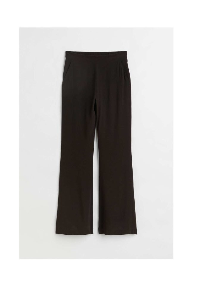 Pants in woven, crêped viscose fabric. High waist, covered elastic at back of waistband, and concealed zipper at one side. Diagonal side pockets and long, wide legs.’