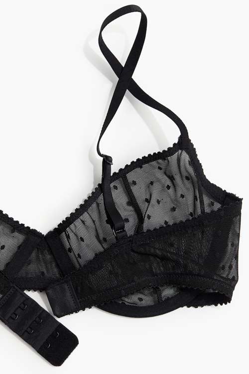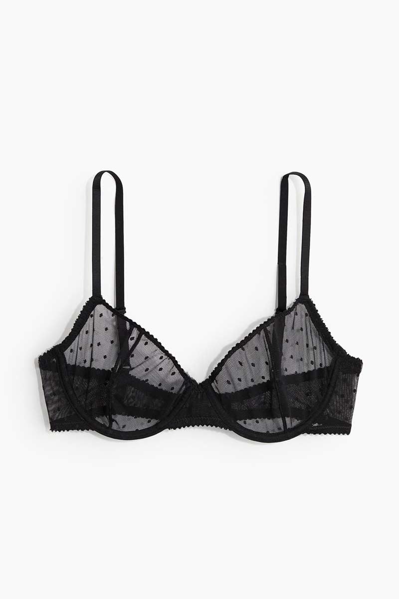 Non-padded bra in patterned mesh with adjustable shoulder straps and underwired, unlined cups that give the bust a natural shape and provide light support. Hook-and-eye fastening at the