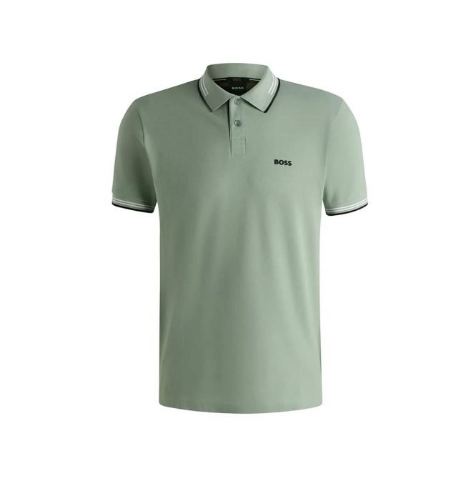 A contemporary polo shirt cut to a defined fit by BOSS Menswear, created in stretch cotton with contrast stripes and branding.