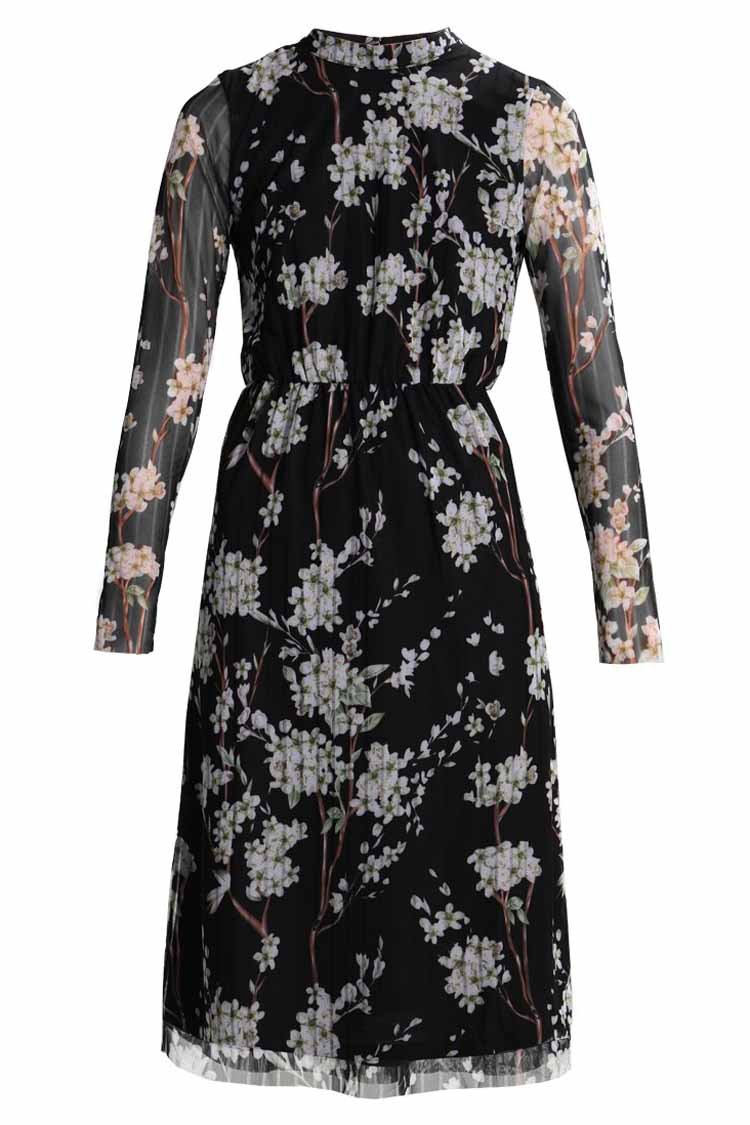 Stand out in the crowd in the YAS Floral Dress. This style features a pastel coloured print on black with high neckline and pleating detail around the waist. Style this dress with heels for a mature and classy look.