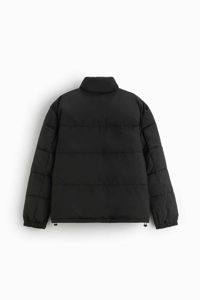 High neck jacket featuring long sleeves with elasticated cuffs, welt pockets at the hip and inside pocket detail. Zip-up front.