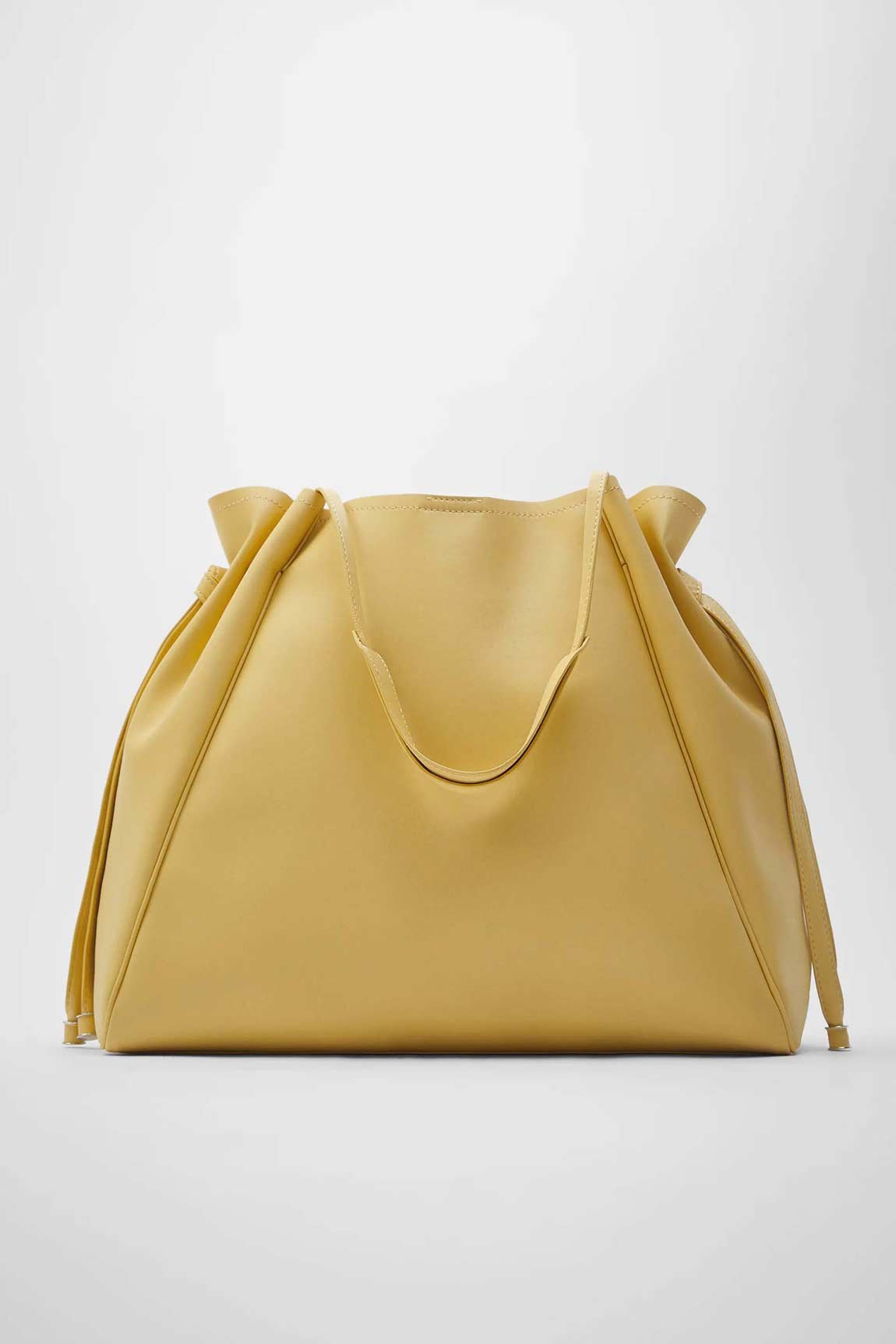 Tote bag available in different colours: yellow and beige. Gathered soft body with side knot detail. Shoulder straps. Magnetic clasp closure.