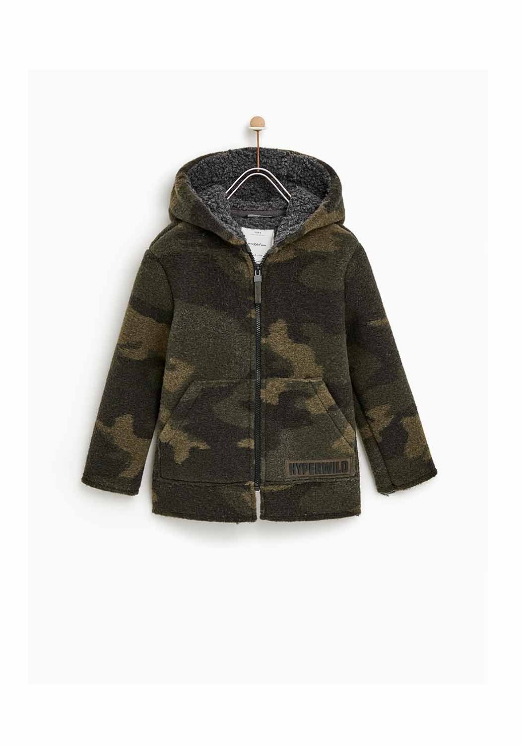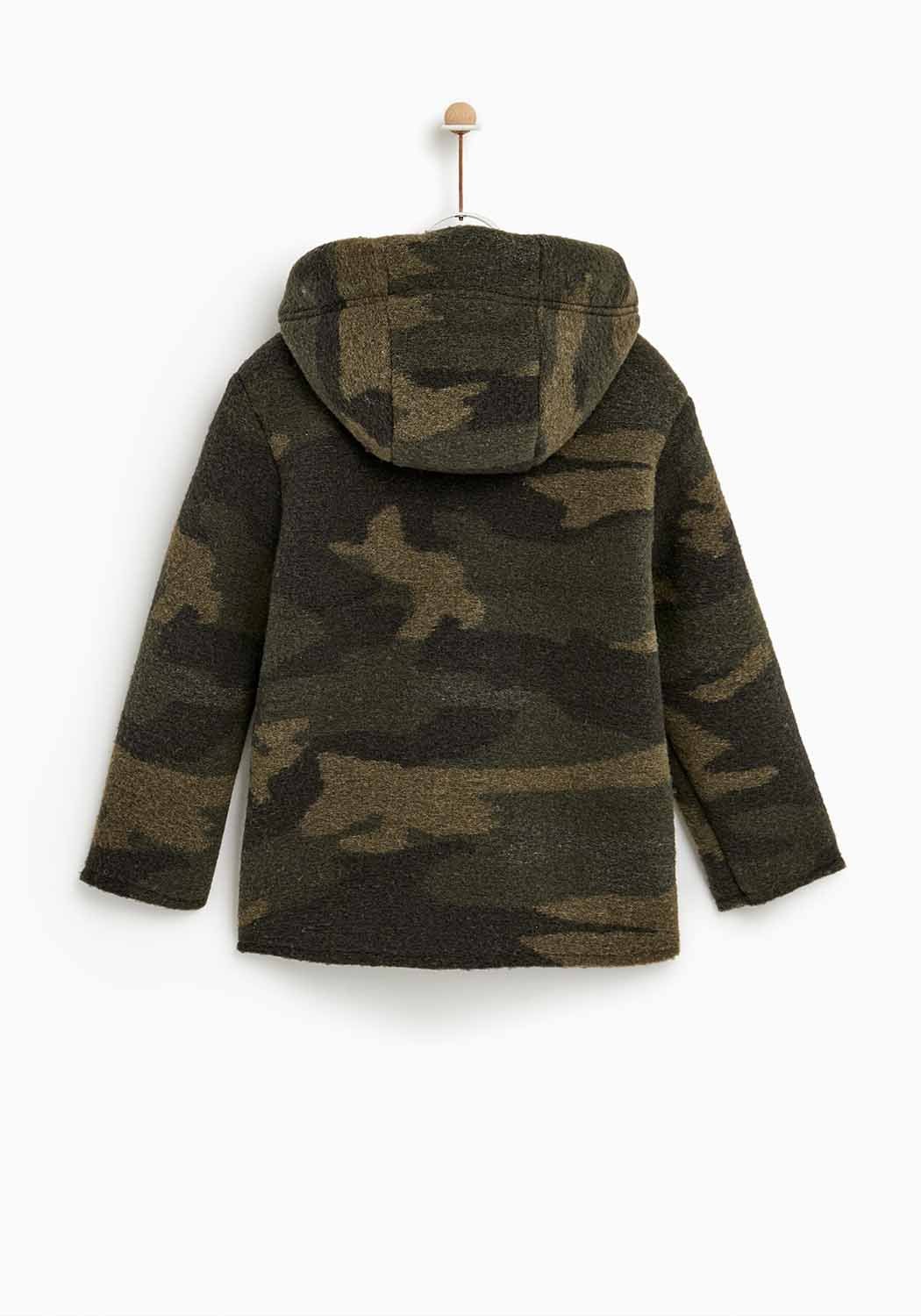 Coat with long sleeves and hood. Front zip closure and pockets. Camouflage print.
