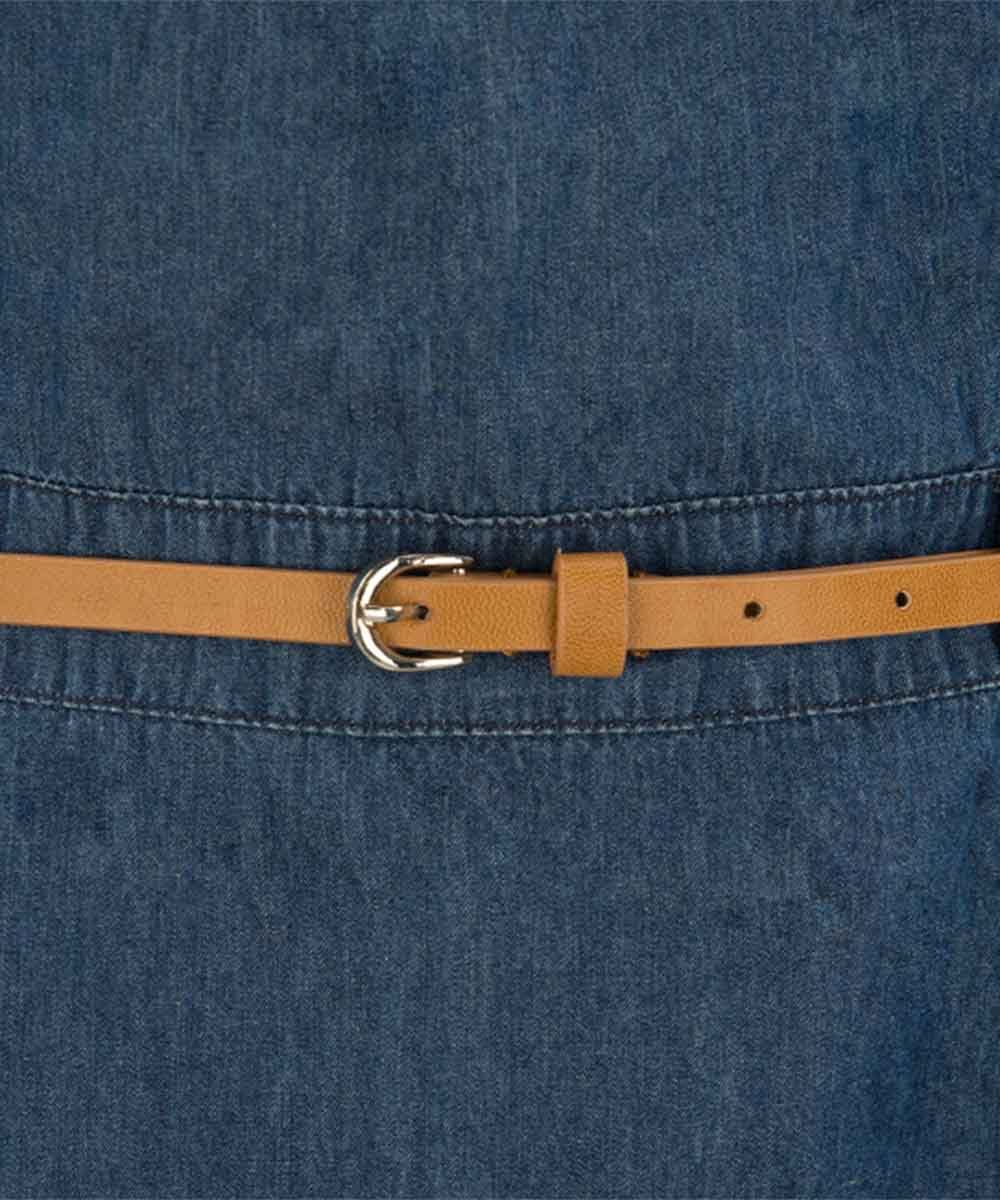 Round-neck dress, sleeveless, and seam at waist with belt and flared skirt.